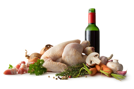Ce sera un coq rouge, assez vieux parce qu’il y a déjà son petit fils qui prend sa place, alors il est bon pour la marmite. Préparez le coq et tranchez-le en gros morceaux. Les mijoter pour une heure de temps avec de l’ail haché et de la sauce soja. Préparer les légumes à base de carottes, en les découpant en petit morceau, puis verser deux verres de vin rouge sec. Et pour garder une bonne odeur, déposez un bouquet garni en dessus. N’oubliez pas le sel et le poivre et laissez mariner dans la garde à manger pour une heure encore.